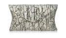 This envelope clutch in pearlized metallic boa print leather is gathered for a unique look. It is accented with brushed metal studs and has a matching brushed gold chain.